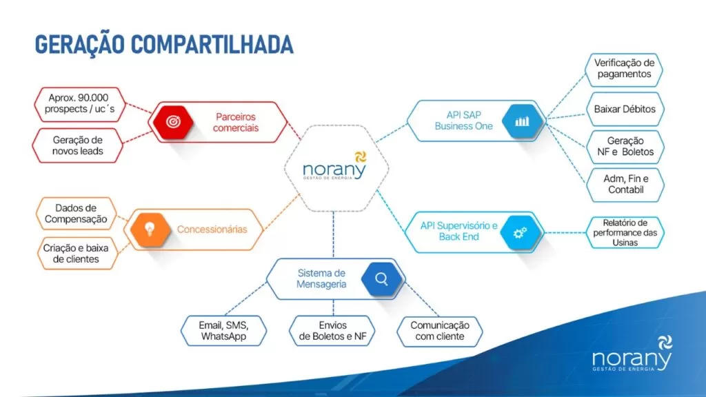 A plataforma da Norany é um sistema inovador que facilita a negociação e o acesso à energia limpa, gerada por usinas de micro ou minigeração. Ela permite que múltiplos consumidores compartilhem a energia produzida, que é injetada na rede elétrica e distribuída, resultando em uma redução significativa nas contas de energia dos participantes.